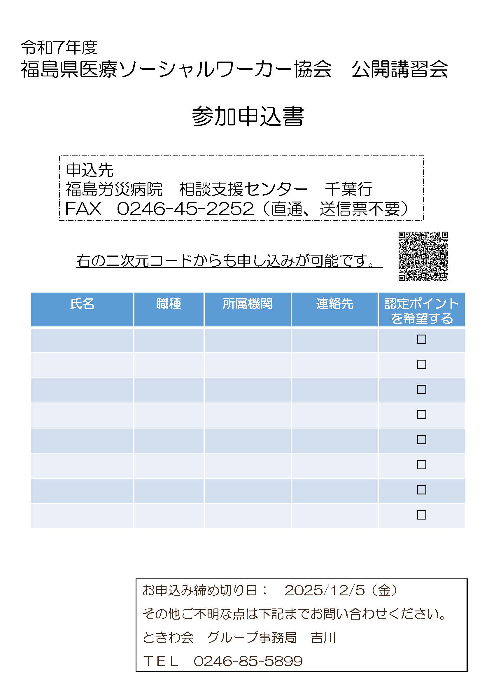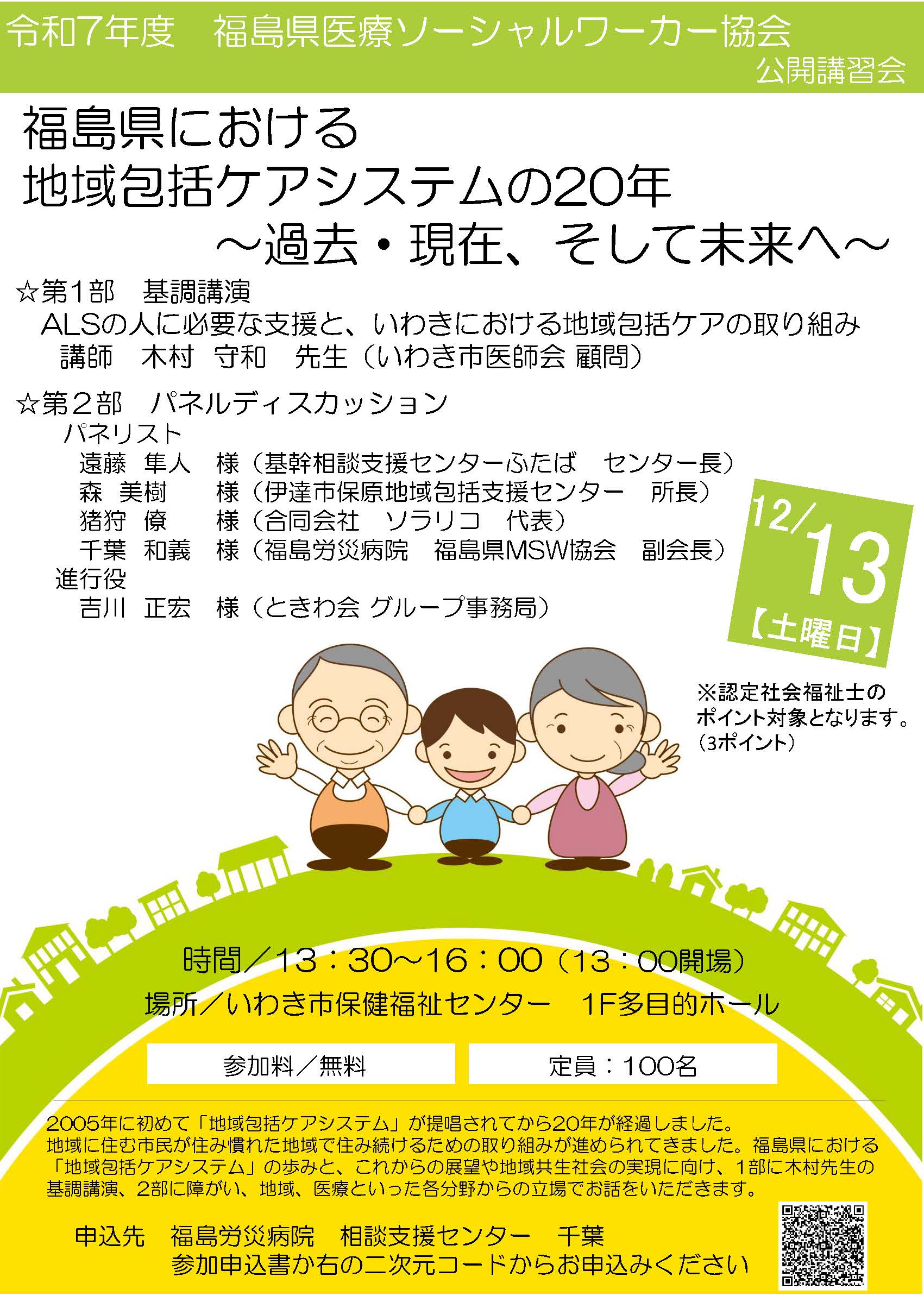 12月13日、いわき市総合保健福祉センターにて「令和7年度 福島県医療ソーシャルワーカー協会 公開講習会」を開催します。テーマは「福島県における地域包括ケアシステムの20年 ~過去・現在、そして未来へ~」。