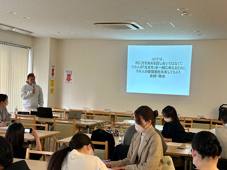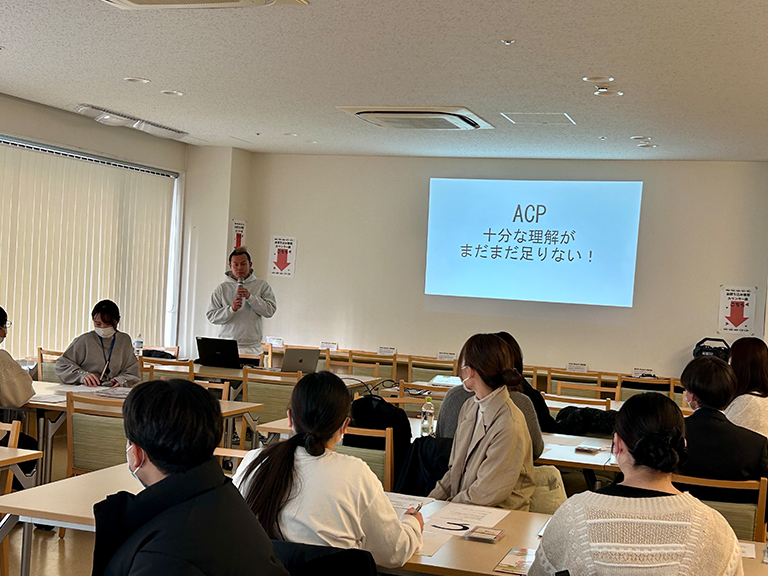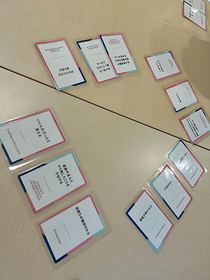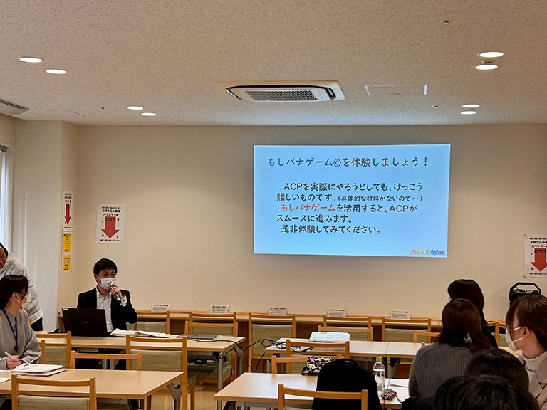 今回のテーマは「もしもの話、してみませんか?~MSWのためのACP体験研修会」でした。郡山医師会「チームやっぱり最期は家がいいかない実行委員会」の皆さまにご協力いただき、講義でACPについての理解を深め、もしバナカードで自分自身と向き合い、お互いの考えを共有しました。